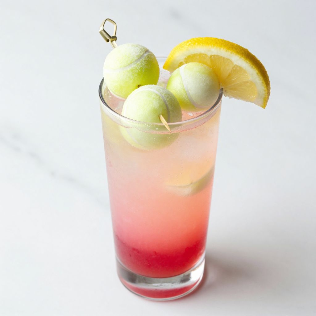 The name plays on tennis scoring terminology where "deuce" means a tied score. The three honeydew melon balls represent tennis balls, turning a simple vodka lemonade into a themed cocktail that captures the spirit of the tournament.
